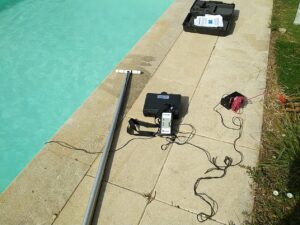 La méthode de détection du Leak Trac 2400 pour la recherche de fuite piscine consiste à placer une petite charge électrique basse tension dans l’eau du bassin. Ce courant circule à travers l’eau et établit des connexions conductrices vers le sol via les perforations, fissures ou petits trous dans le liner ou la coque. Lorsque cette connexion se forme, l’électricité s’échappe vers la prise de terre, et le détecteur capte ce flux. Un signal sonore est alors émis par l’appareil, dont la fréquence augmente à mesure que la sonde de détection s’approche de la fuite, permettant ainsi une localisation précise et rapide de la fuite piscine, sans vidange ni démontage.